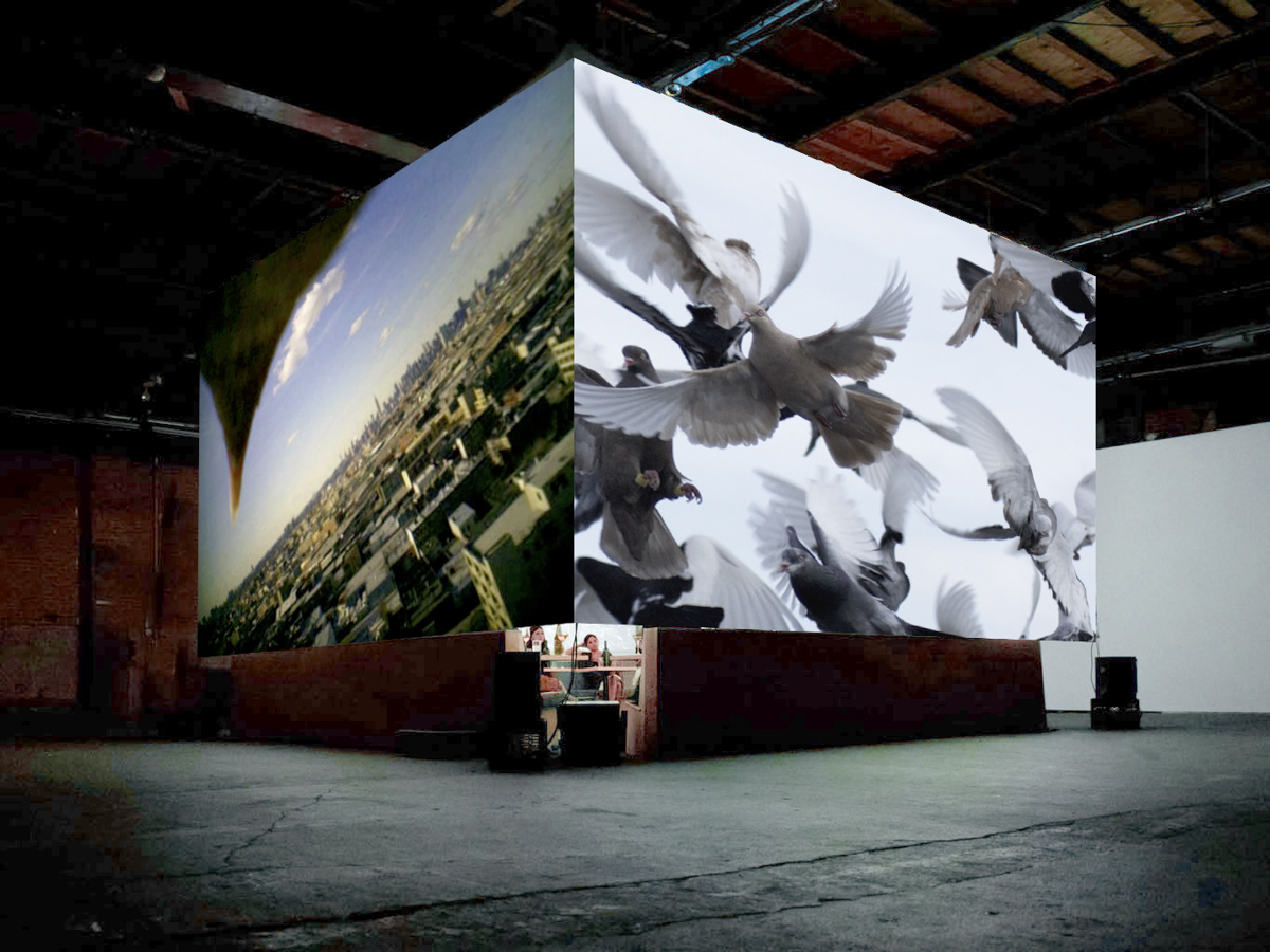 Apart Together records domesticated pigeon flocking through three different perspectives. Each perspective shares the same ambient audio recording from the surrounding landscape using the birds and the city as an amphitheater. The first perspective is from afar - a macro perspective focused on group behavior and the geometric renderings “drawn” by the group. The second zooms into a closer view illustrating the structural web like contribution of each individual. The third and final view is from the perspective of the individual itself, giving the viewer the experience of flight - altering our relationship from observer to participant, identifying the contrasting relationship between the individual and the collective.