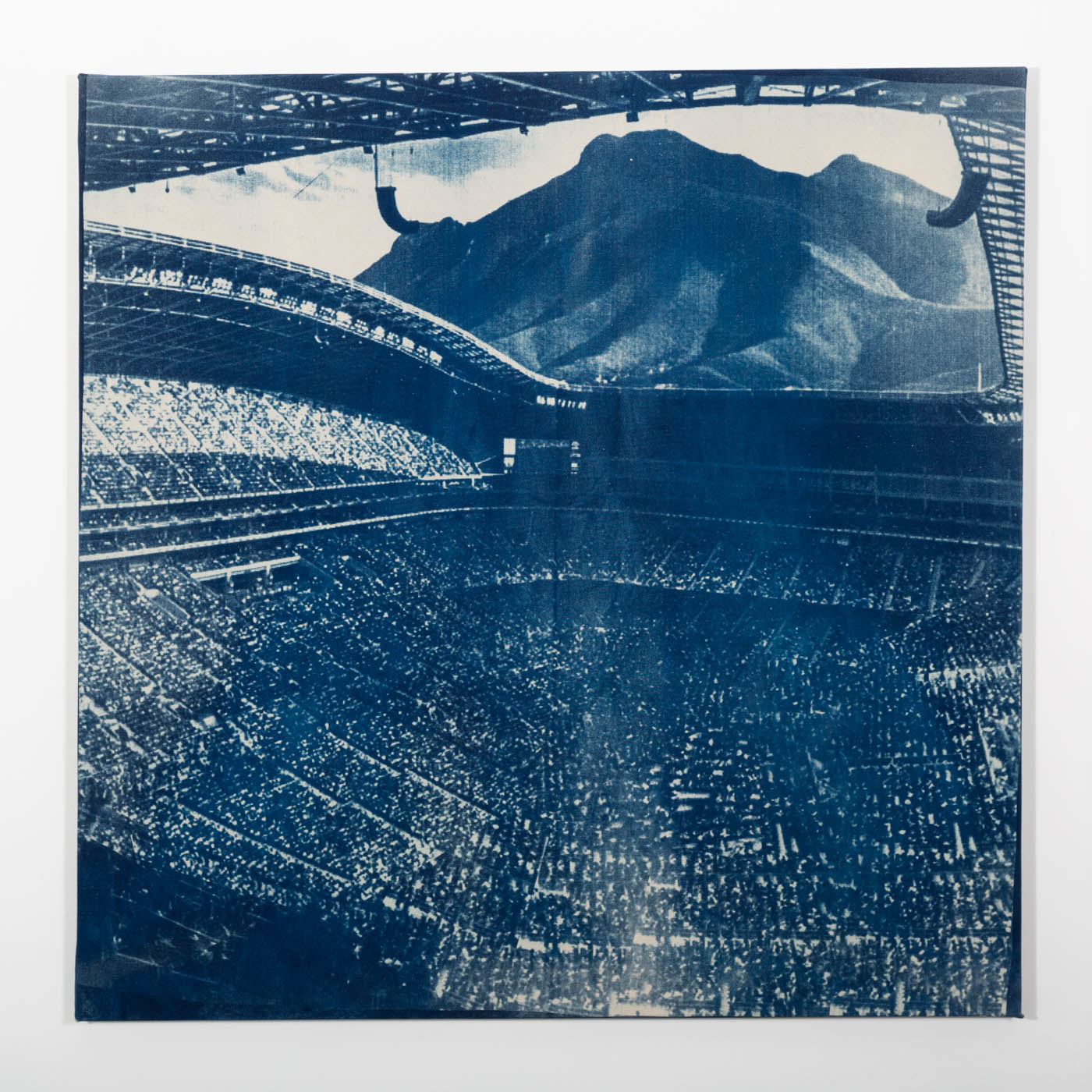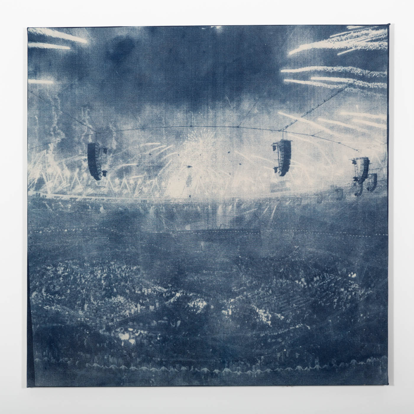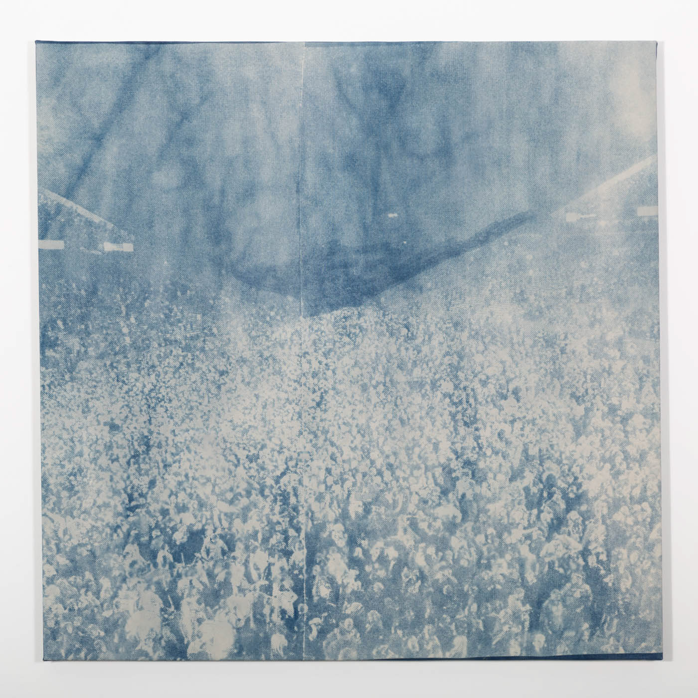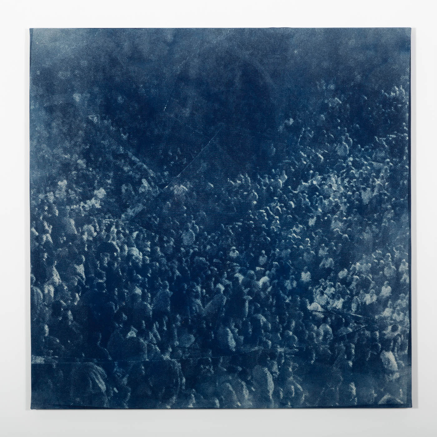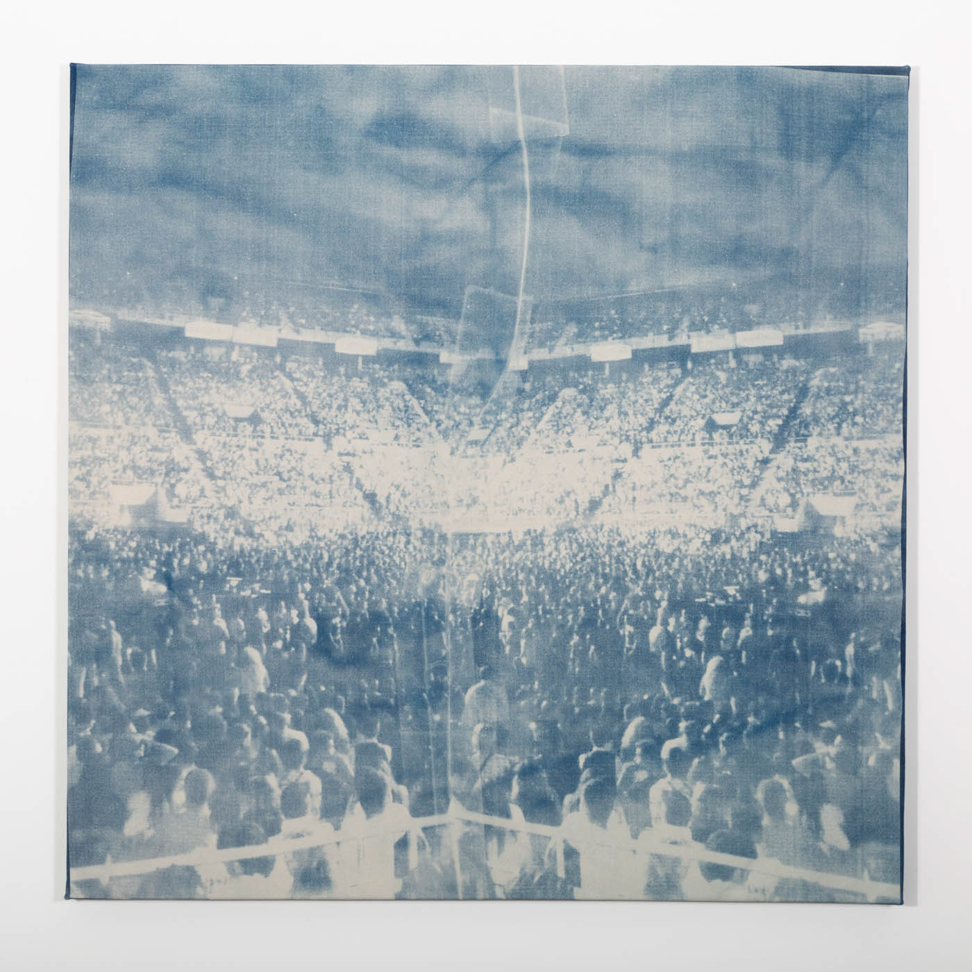 For the cyanotypes, Fleming uses hand collage to remove the spectacle of large scale gatherings, and scrubs the image of identifying symbols or advertisements while the process of hand collage, sometimes revealing tape or cut marks is revealed. The tell of manipulation points to the intention of removing the spectacle and in turn, points to a new way of seeing a mass gathering as the group itself. The prints stand as an agitator — challenging one’s affective response to groups, gatherings, and celebration. It is perhaps a matter of trust, culture, and identity that promotes a variable reaction of agoraphobia to solidarity. The images are then scanned and enlarged to a scale that brings the viewer into a direct experience with the scene, superimposing and feeling themselves within the event, large negatives are created, and eventually exposed as cyanotypes using the inevitable unpredictability of the sun, creating a series of unique images.