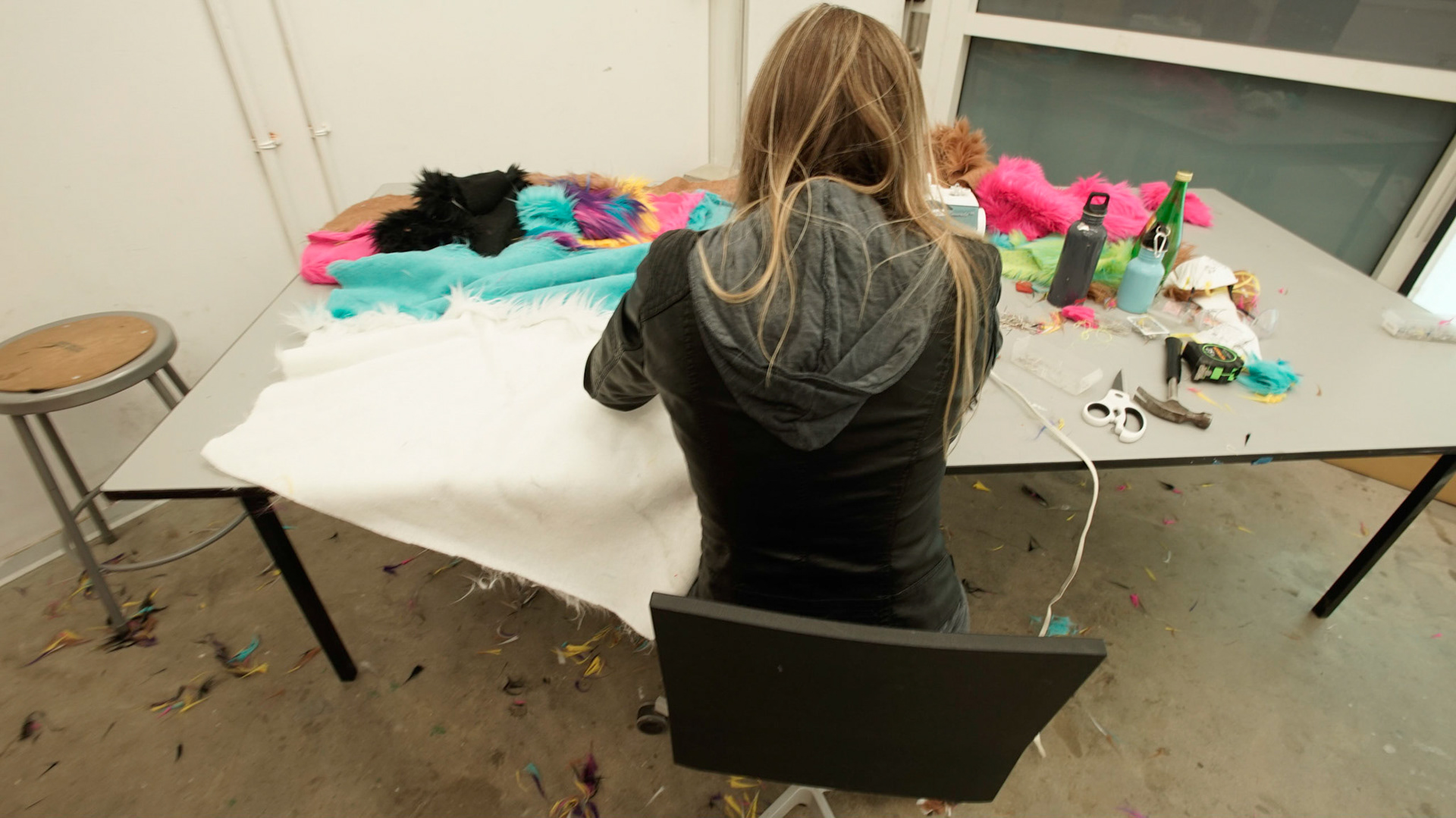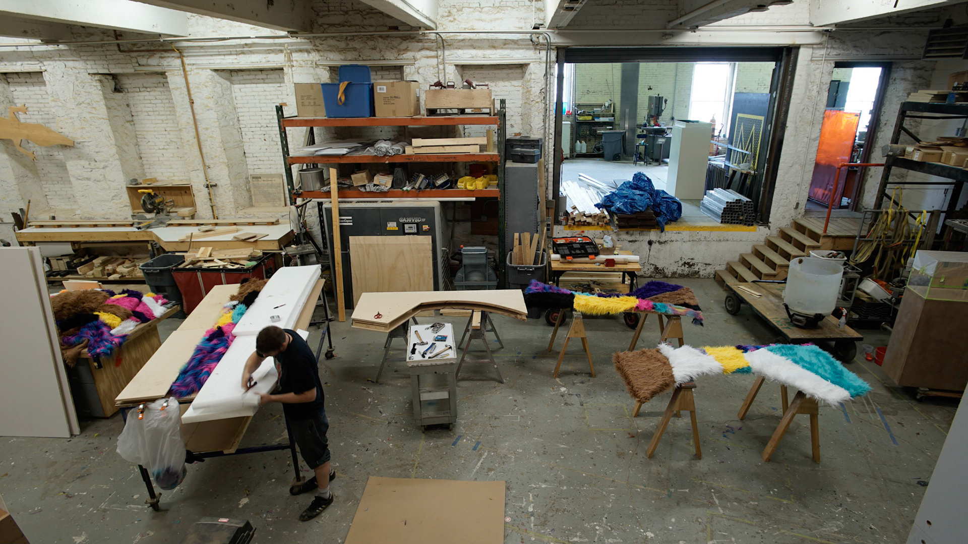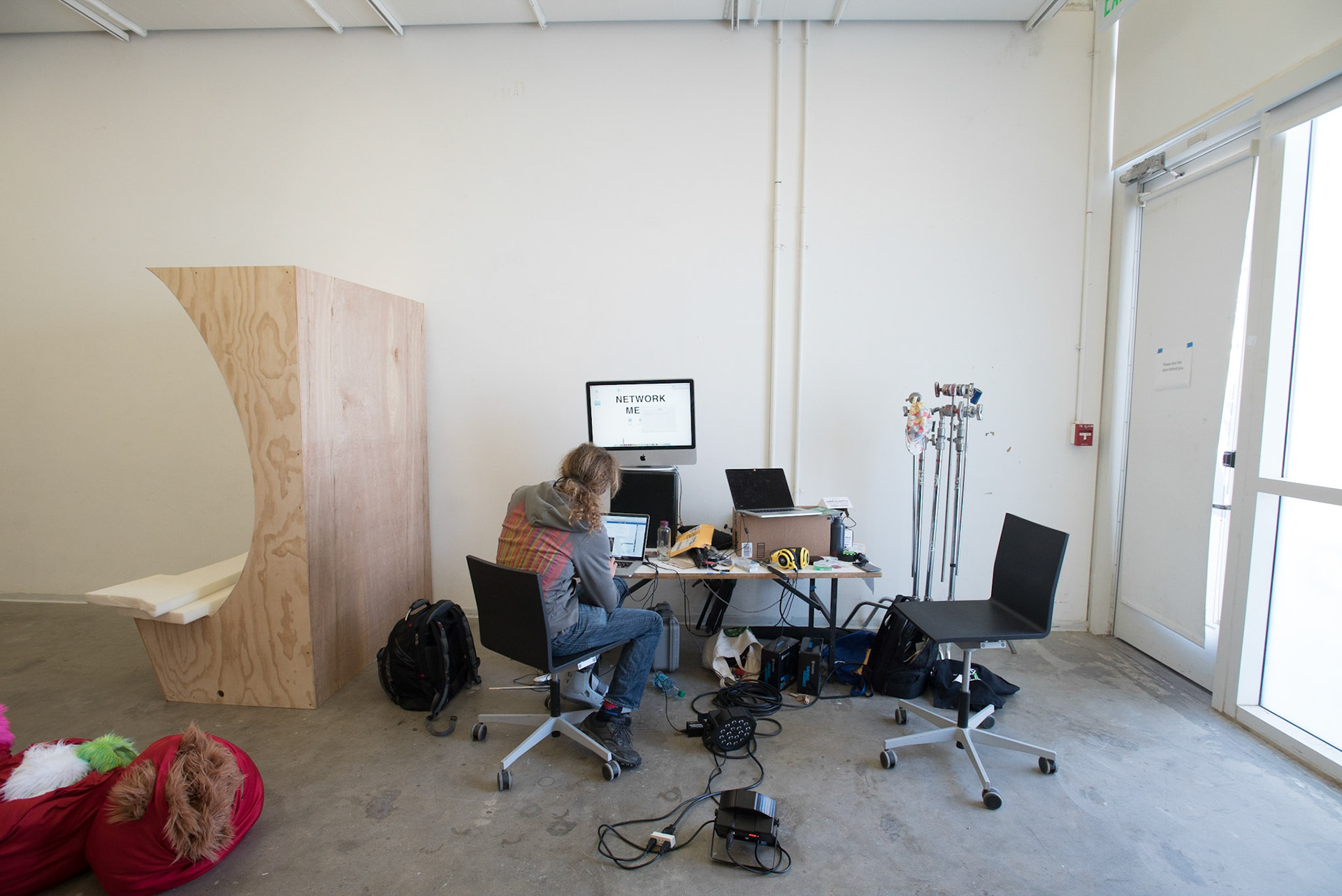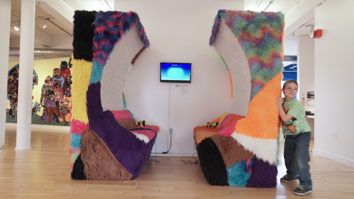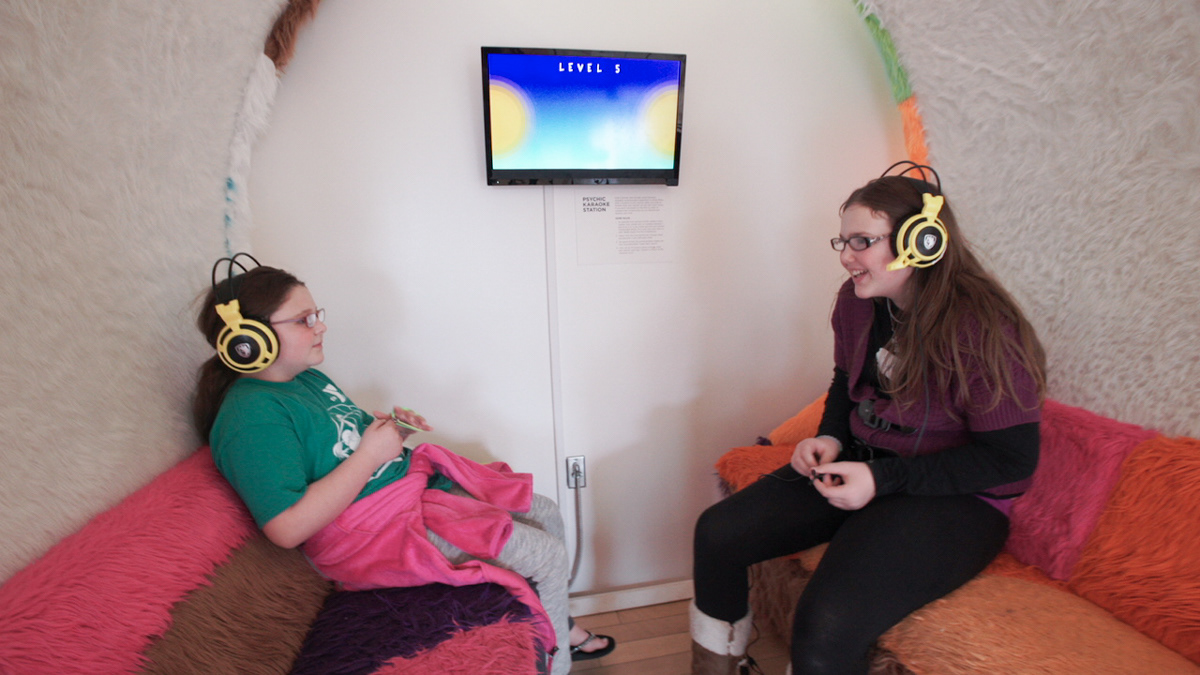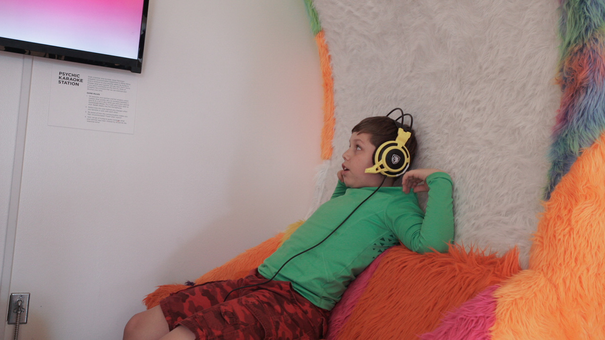 PSYCHIC KARAOKE, Commissioned by Mass MOCA Kidspace, Psychic Karaoke is an immersive and interactive followup to Mirror Mirror, which was simultaneously exhibited at Mass MOCA. This interactive arose out of the desire to enable the audience to become participants of the mirror neuron inspired game within Mirror Mirror. The concept is that as humans, first we have attunement (the capacity to connect with one another), from this attunement we start to feel each other’s emotions (empathy), and from holding this empathetic connection we enter into compassion. Psychic Karaoke seeks to train this process like a muscle and simultaneously demystify the territory of connection via the findings of contemporary neuroscience made fuzzy, huggable, humorous, enticing, goofy, and gamiified. In the end, the apparatus is a ruse for inspiring connection between kids, parents, or anyone looking for a techno-fuzzy friend.